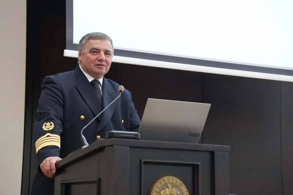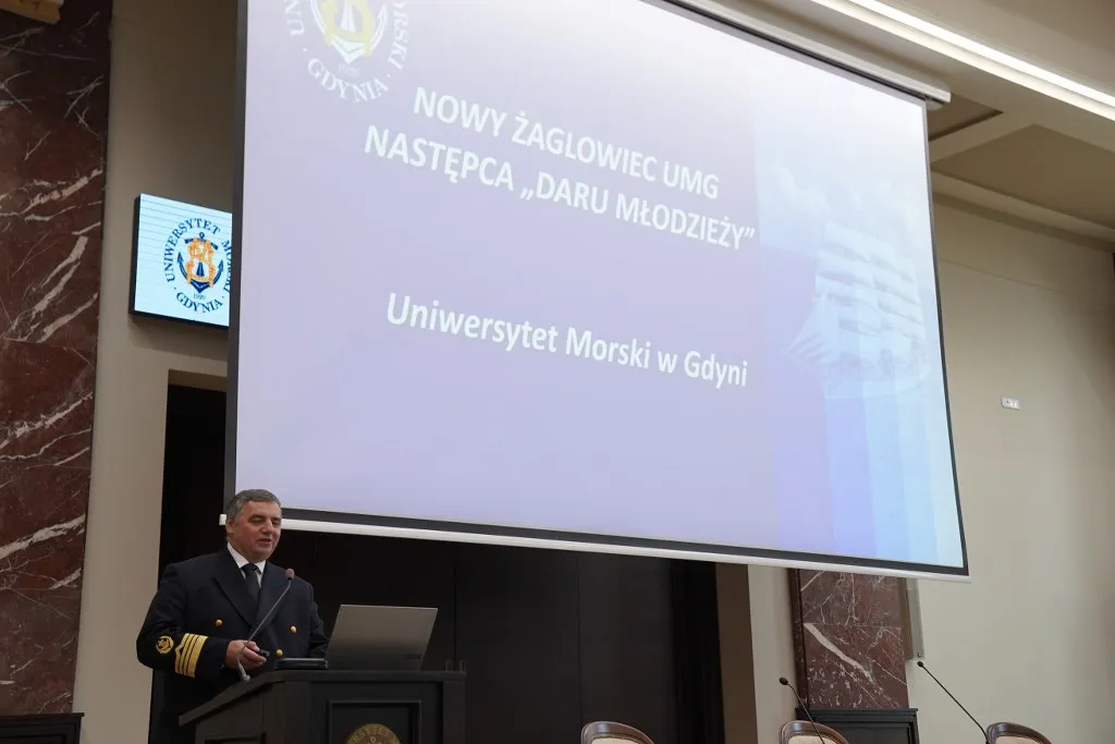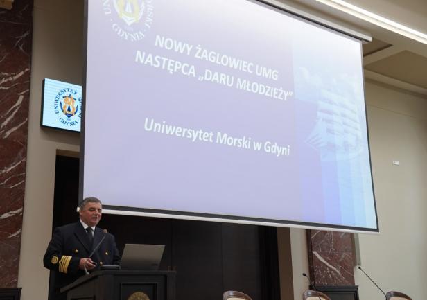 Ostatnim akcentem pierwszej części uroczystości był okolicznościowy wykład popularnonaukowy, wygłoszony przez JM Rektora prof. dr. hab. inż. kpt. ż.w. Adama Weintrita – specjalistę z zakresu transportu morskiego, geodezji i kartografii. W swojej prezentacji przedstawił plany związane z nowym żaglowcem, następcą Daru Młodzieży UMG.