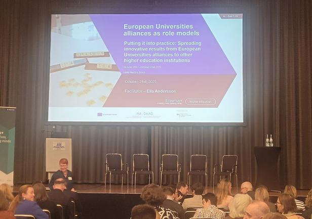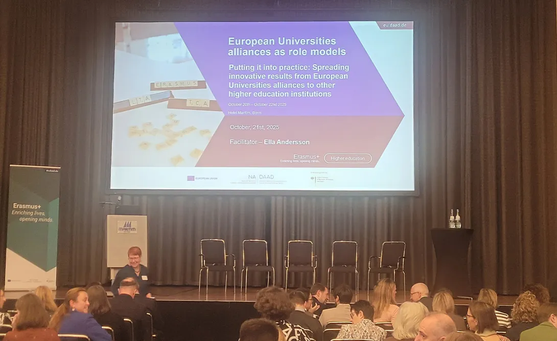 Międzynarodowa konferencja „Wdrażanie w praktyce – rozpowszechnianie innowacyjnych wyników sojuszów uniwersytetów europejskich do innych instytucji szkolnictwa wyższego” odbyła się w Bonn w dniach 20-22 października 2025 roku. Wydarzenie, zorganizowane w ramach szkoleń międzynarodowych Erasmus+ (TCA – Training and Cooperation Activities), m.in. przez DAAD (Deutscher Akademischer Austauschdienst) i współfinansowane przez Narodową Agencję Programu Erasmus+ i Europejski Korpus Solidarności, zgromadziło blisko 180 uczestników, przedstawicieli uczelni wyższych z Europy.