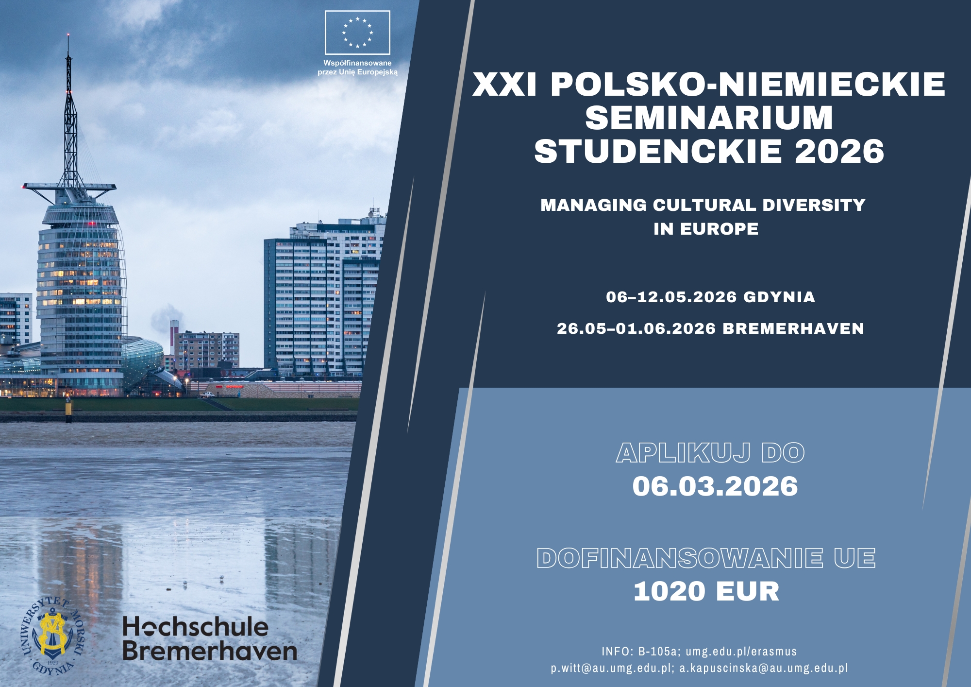 Rozpoczął się nabór studentów do udziału w XXI Polsko-Niemieckim Seminarium Studenckim „MANAGING CULTURAL DIVERSITY IN EUROPE”, organizowanym przez Uniwersytet Morski w Gdyni oraz Hochschule Bremerhaven, pod patronatem rektorów obu uczelni.