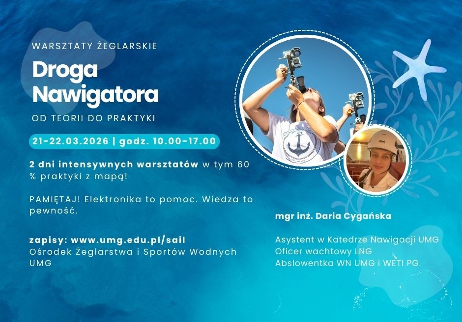 Autorski warsztat “Droga Nawigatora - od teorii do praktyki” przygotowany przez mgr inż. Darię Cygańską pod merytoryczną opieką dr inż. Andrzeja Szklarskiego otwiera nasz program wspierania wiedzą ekspercką miłośników żeglarstwa przez absolwentów UMG.