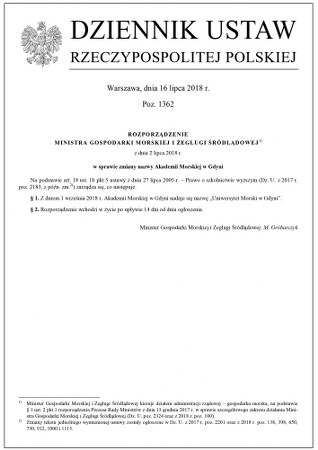 Nazwa Uniwersytet Morski w Gdyni została nadana naszej Uczelni Rozporządzeniem Ministra Gospodarki Morskiej i Żeglugi Śródlądowej (Dz. U. 2018 poz. 1362).