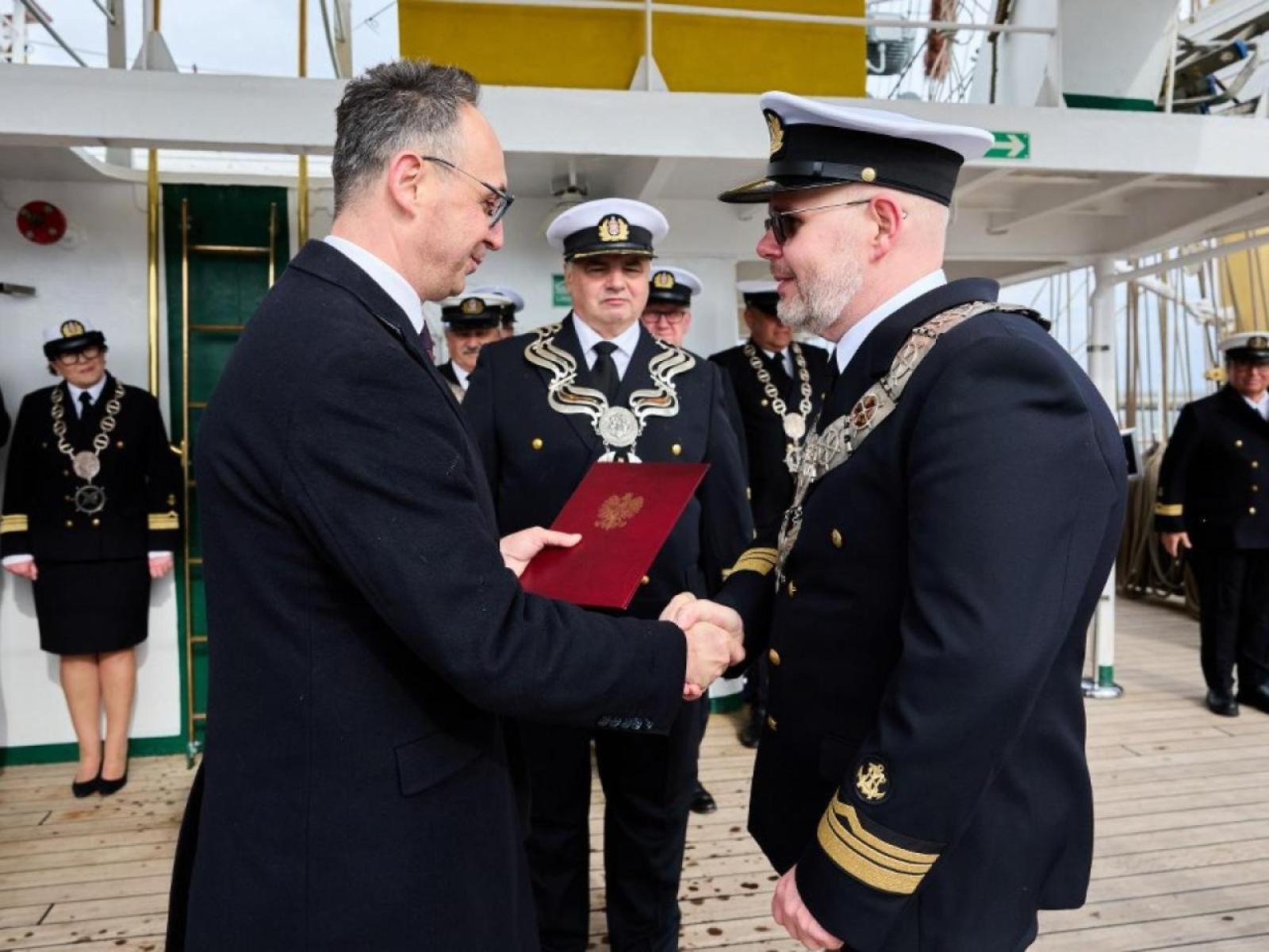 During his speech, the Minister of Infrastructure, Dariusz Klimczak, referred to the decision of the Polish Government to fund the construction of a successor to the Dar Młodzieży and presented HM The Rector of GMU, Professor Adam Weintrit, with the government Resolution, which is the basis for beginning to work on the construction of the University's new tall ship. He also spoke of his hope that the new ship will be quickly built so that those students who are beginning their studies this academic year will be able to learn and undergo training.