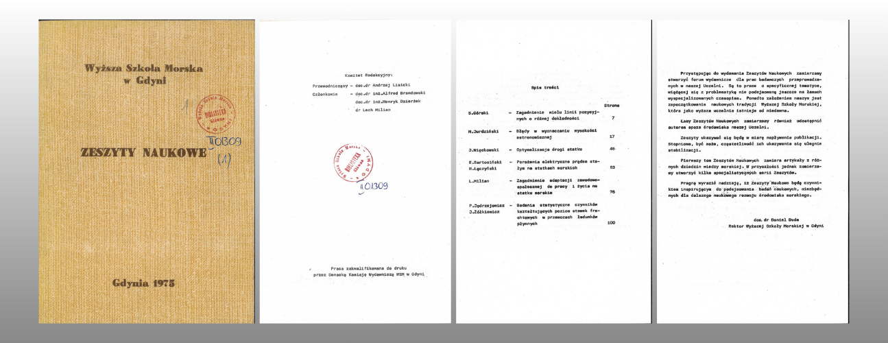 The first edition of the journal was published in 1975, following the decision of the then Rector of GMU, Dr Captain Daniel Duda. He wrote in the preface to the first edition: "This first edition of Scientific Papers [Zeszyty Naukowe] contains papers on different areas of maritime knowledge. Nevertheless, it is our intention to create a series of several specialist journals in the future. I hope that this publication will serve as a source of inspiration for undertaking scientific research essential to the continued academic development of the maritime community.”