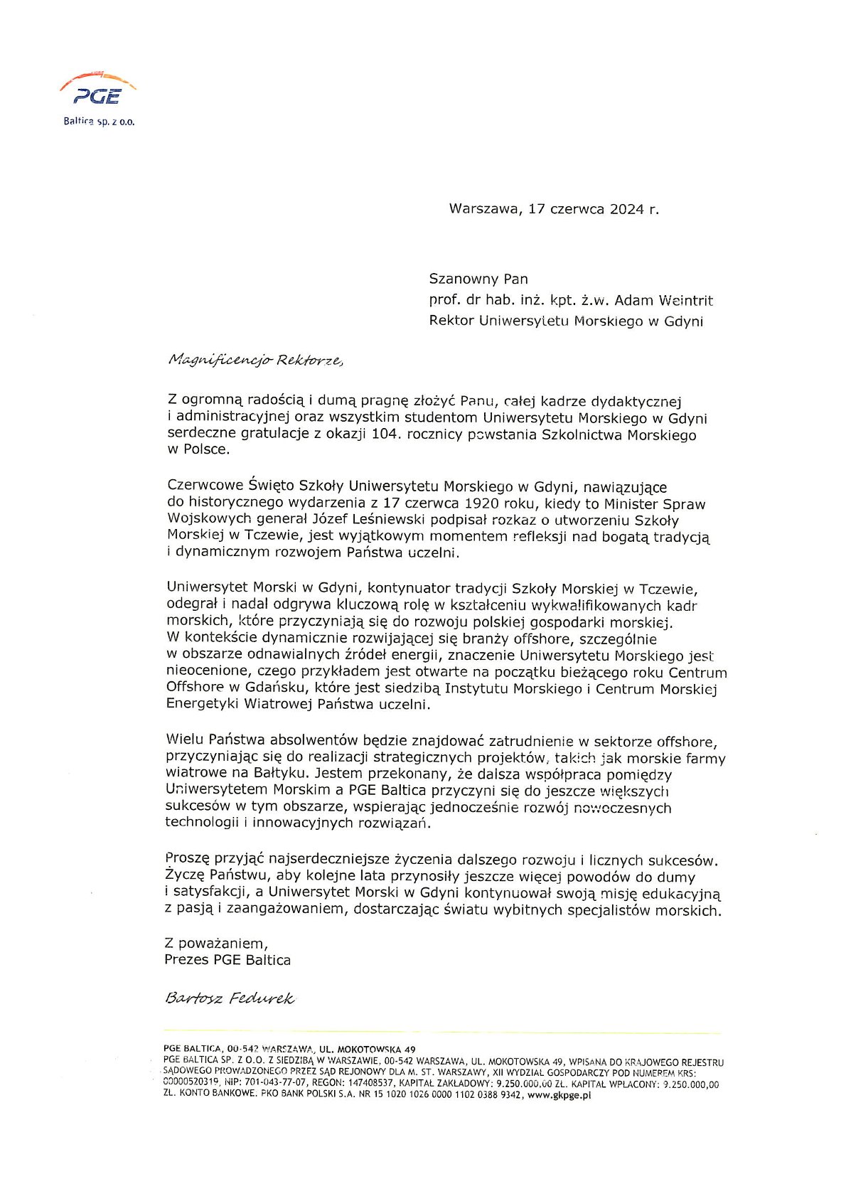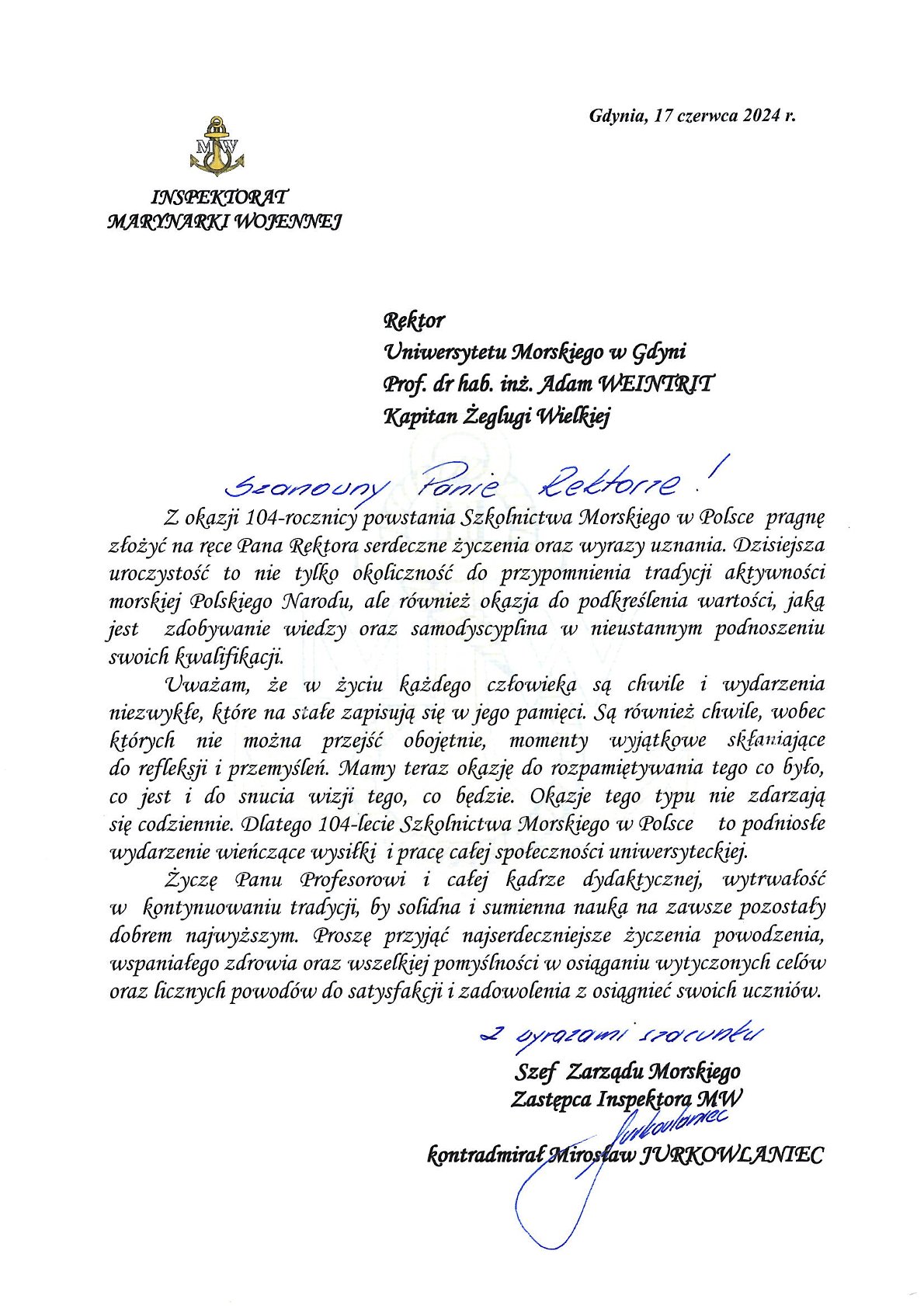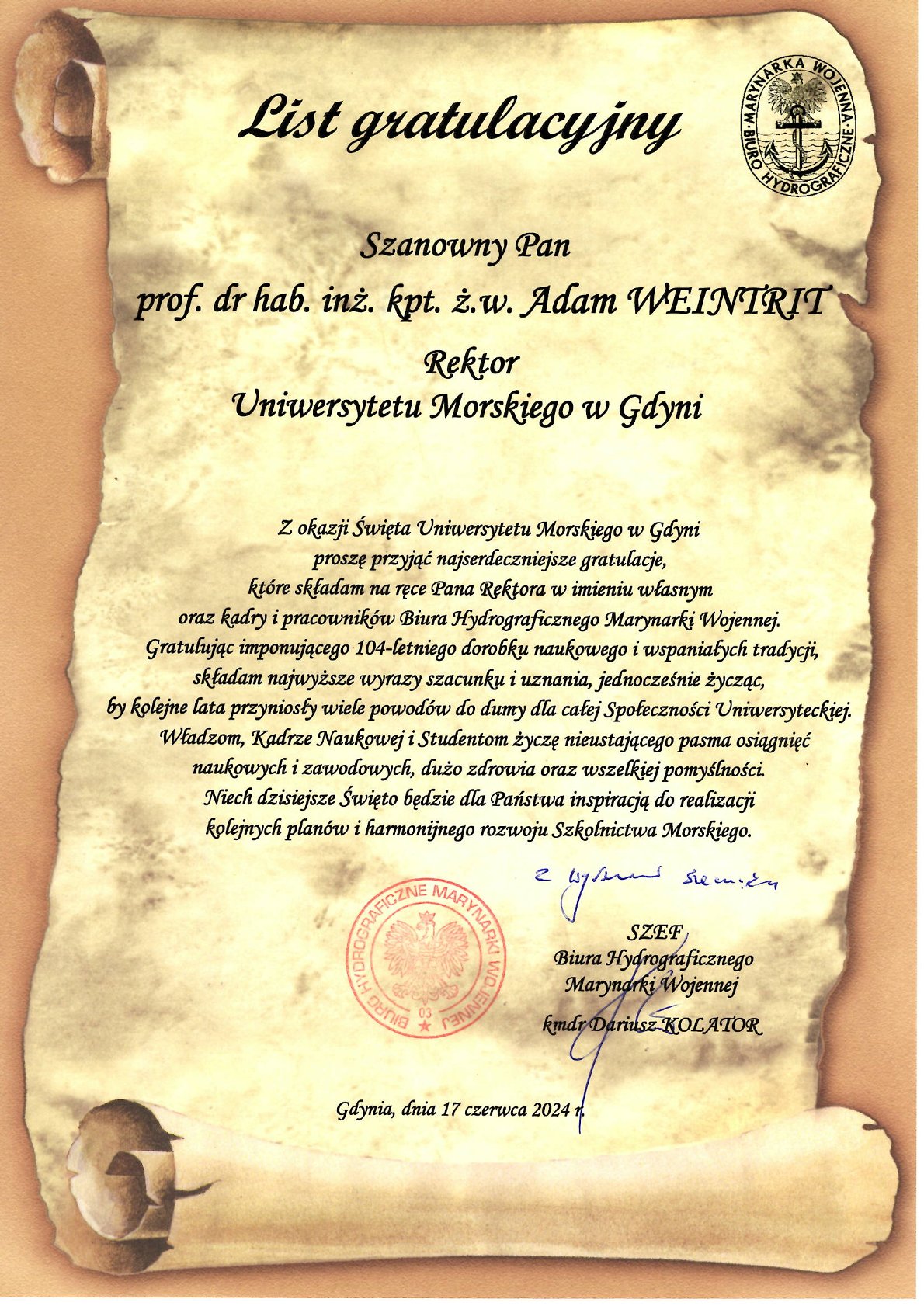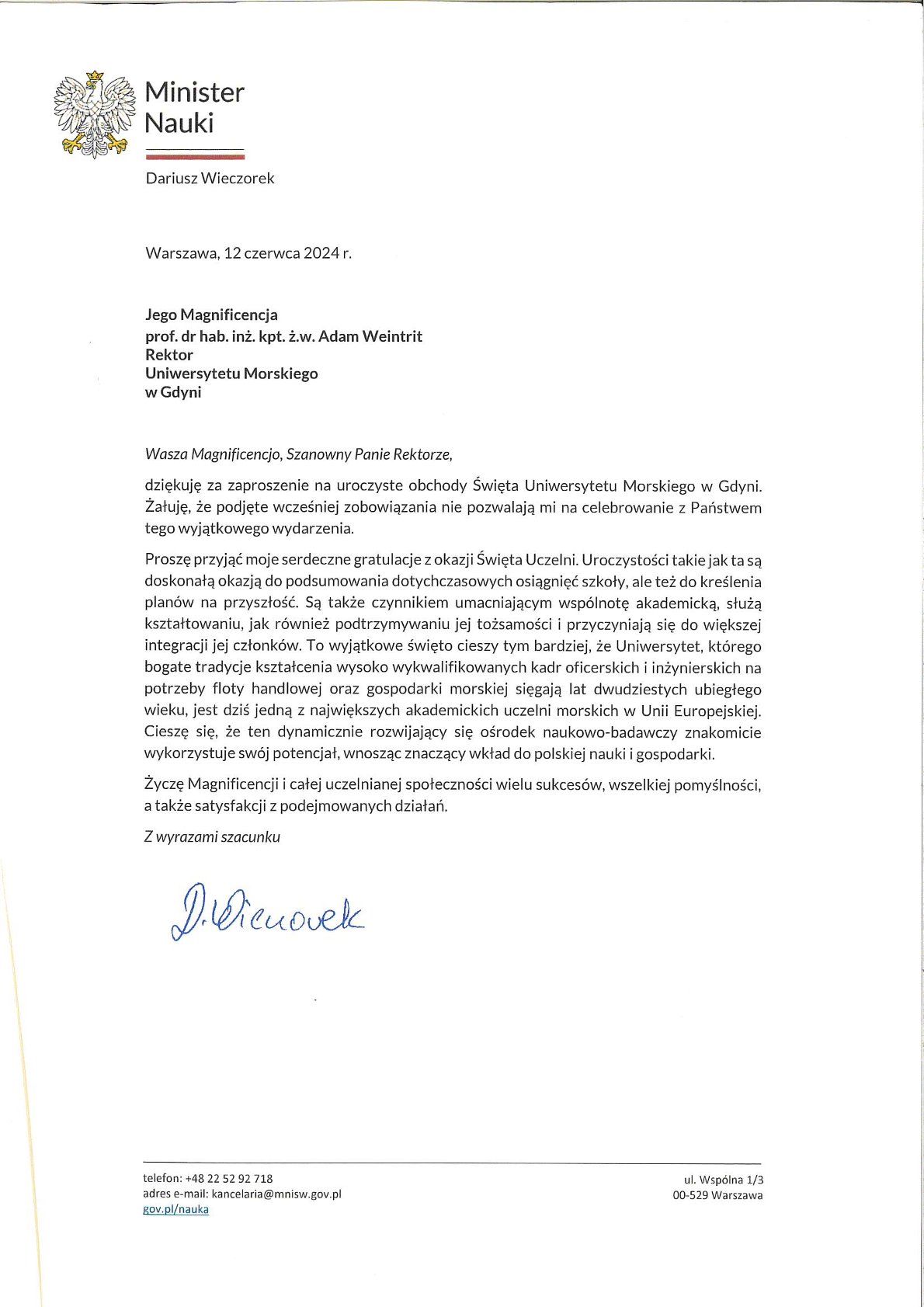 Z okazji 104. rocznicy powstania Szkolnictwa Morskiego w Polsce życzenia i listy gratulacyjne na ręce JM Rektora Uniwersytetu Morskiego w Gdyni złożyli: