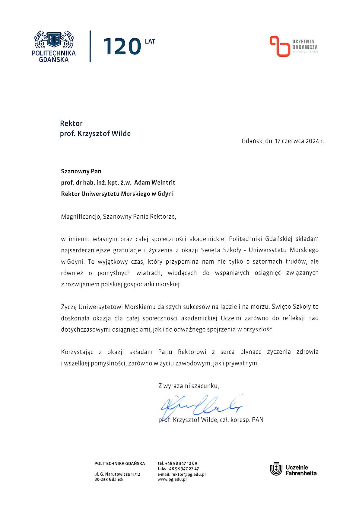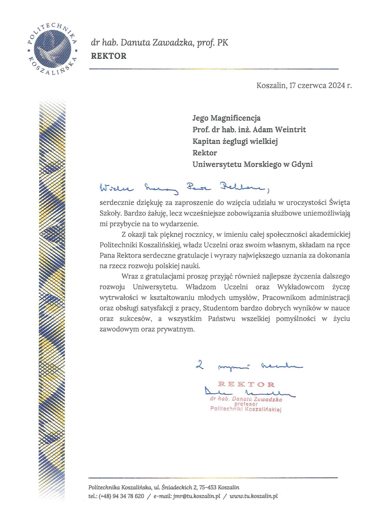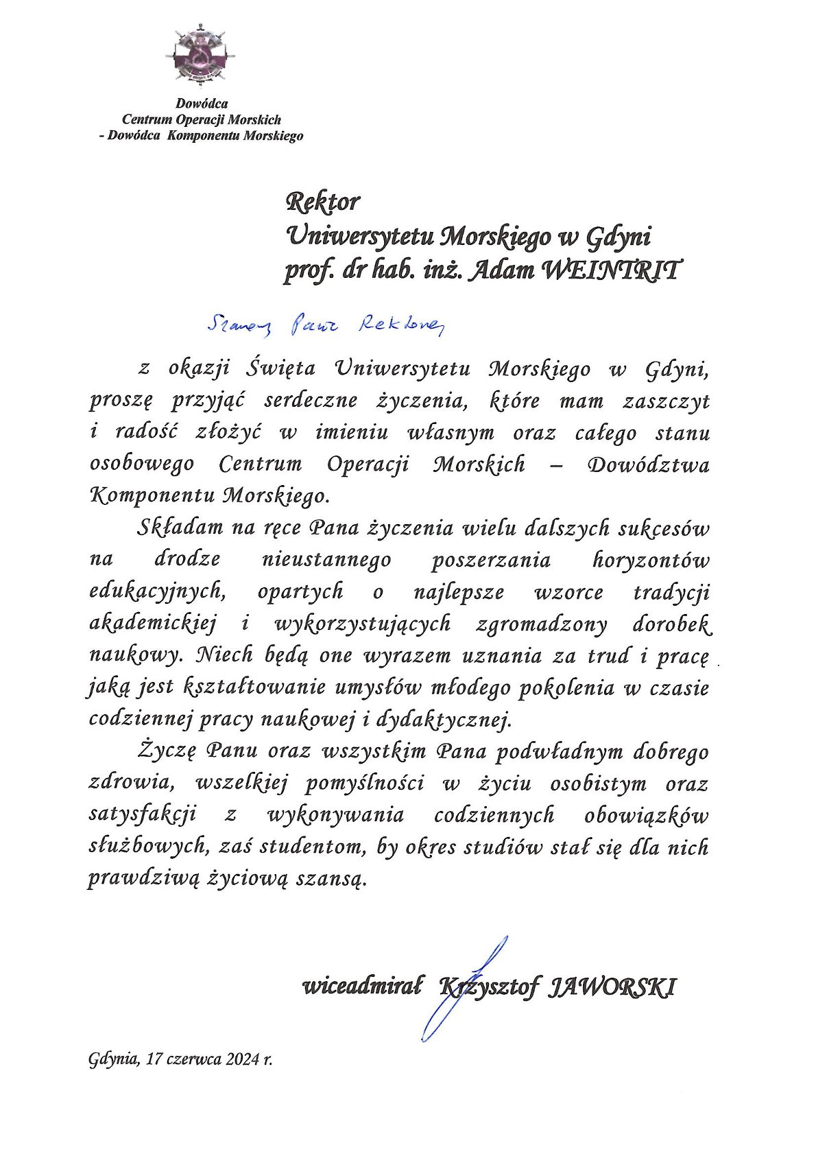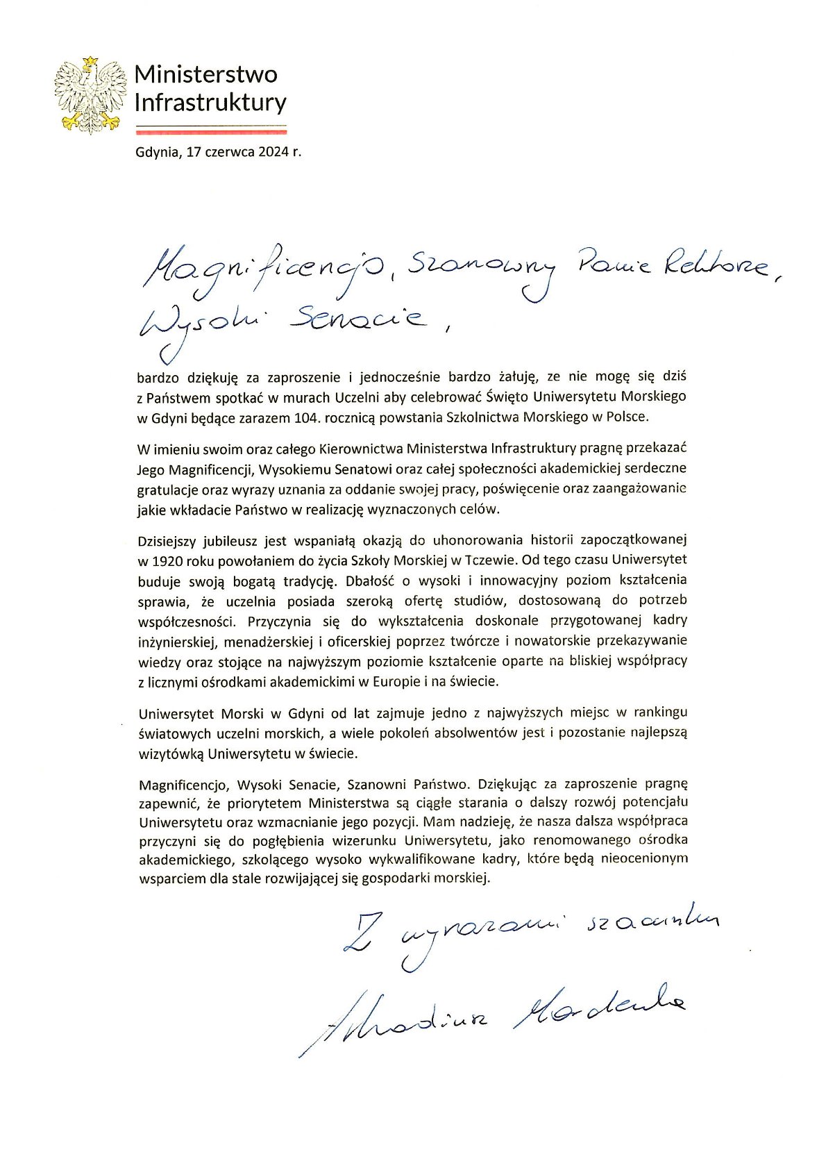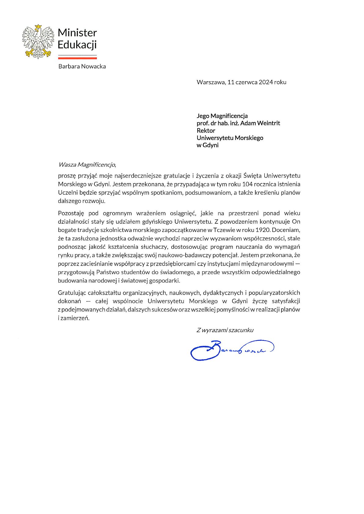 Z okazji 104. rocznicy powstania Szkolnictwa Morskiego w Polsce życzenia i listy gratulacyjne na ręce JM Rektora Uniwersytetu Morskiego w Gdyni złożyli:
