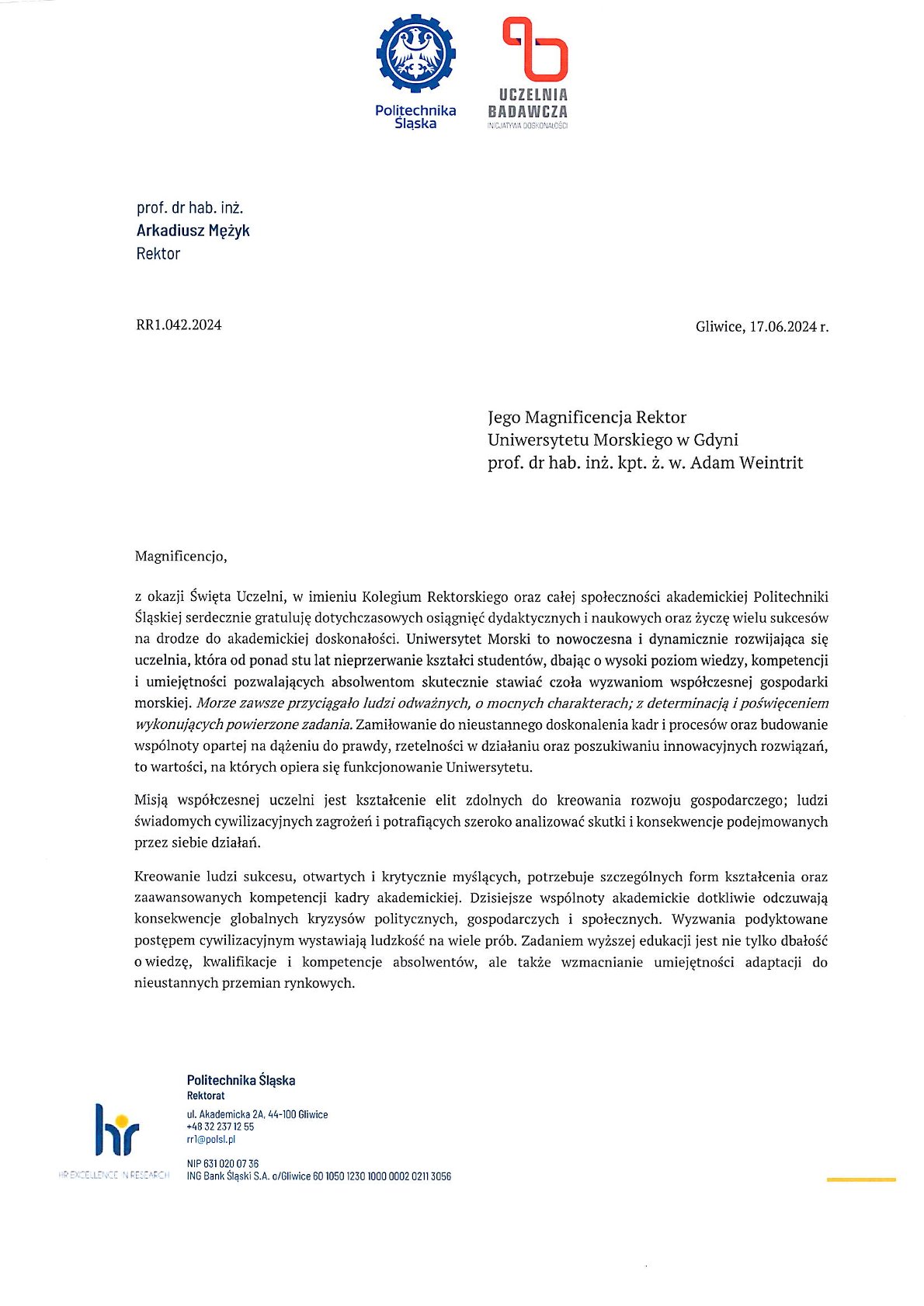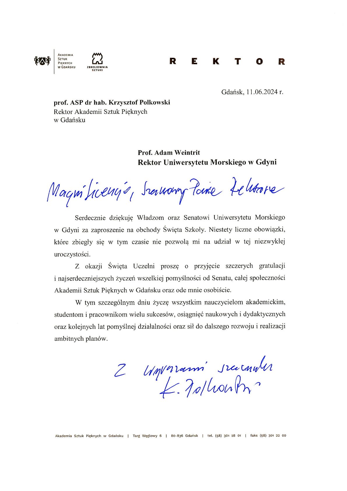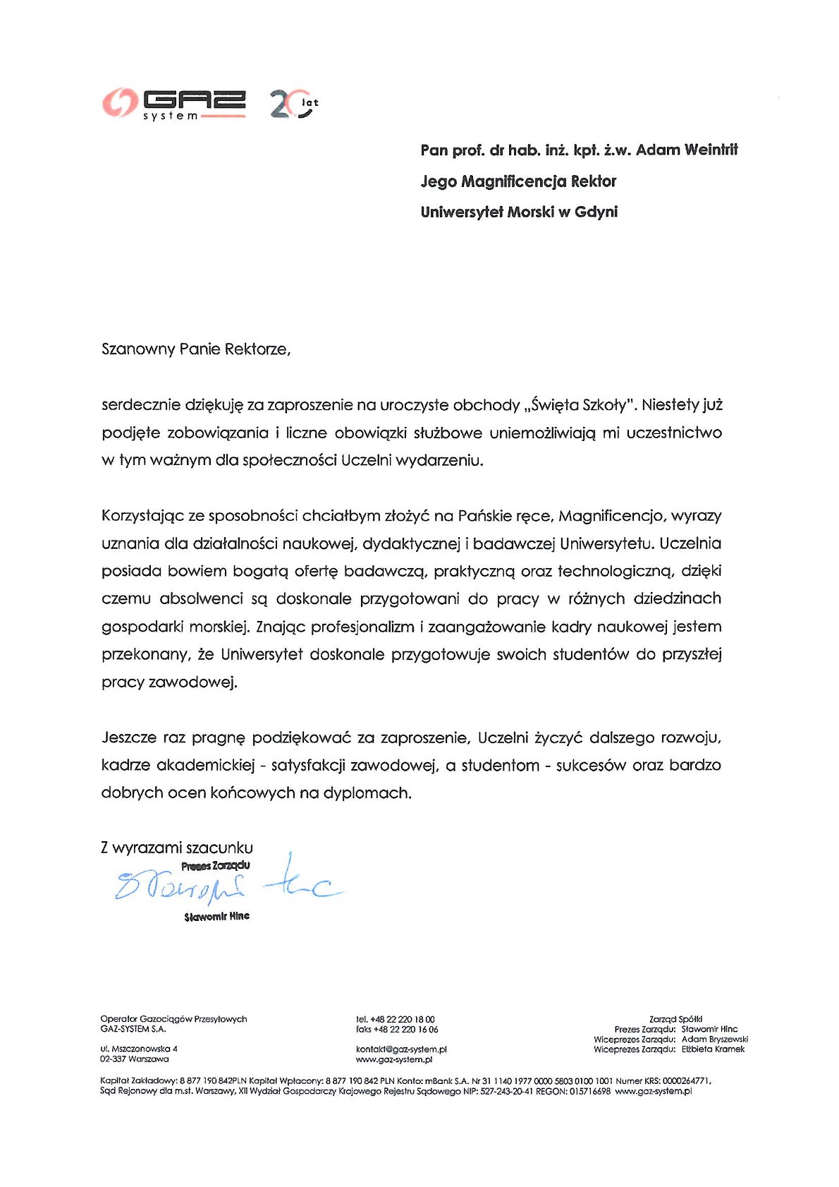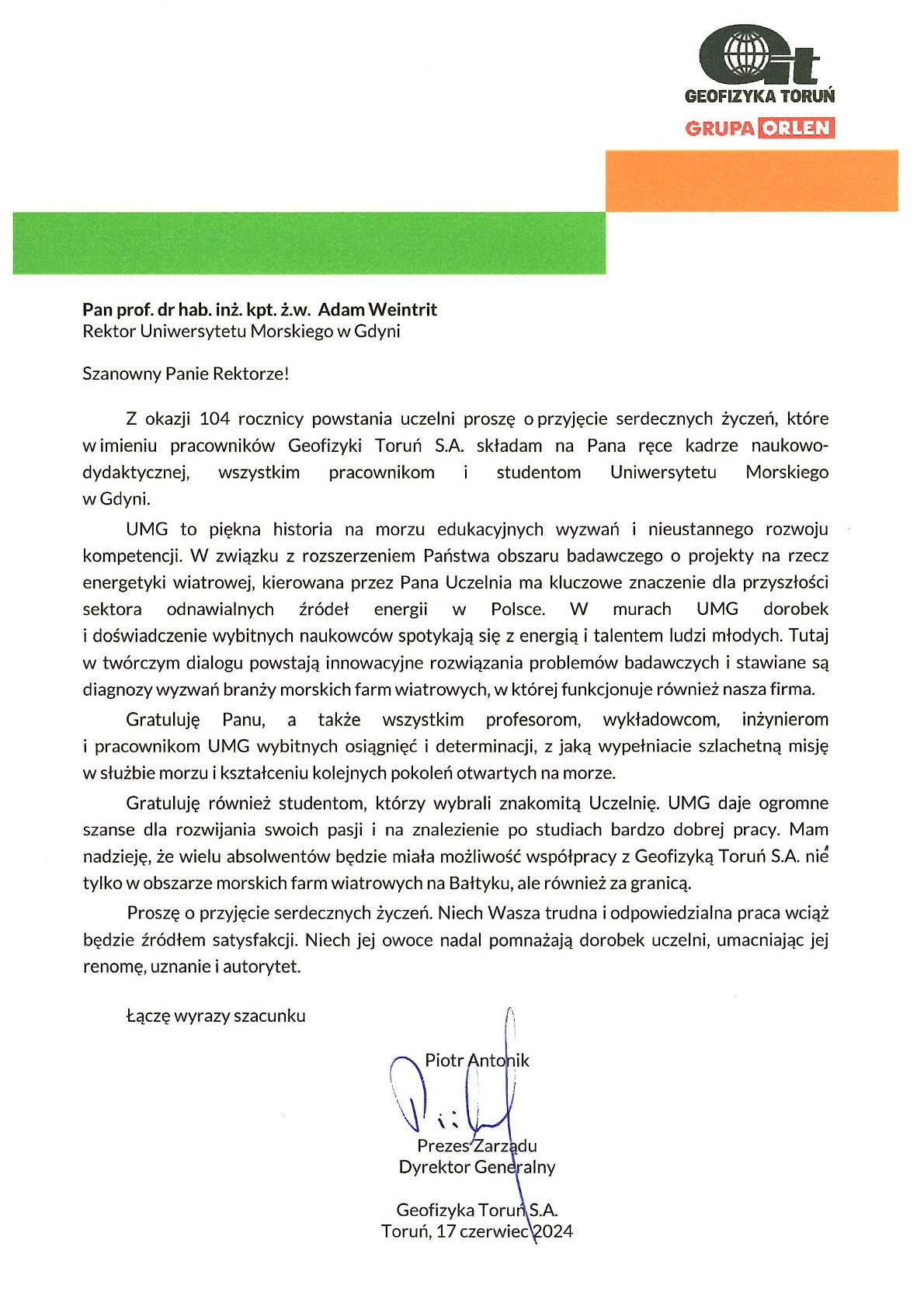 Z okazji 104. rocznicy powstania Szkolnictwa Morskiego w Polsce życzenia i listy gratulacyjne na ręce JM Rektora Uniwersytetu Morskiego w Gdyni złożyli: