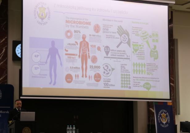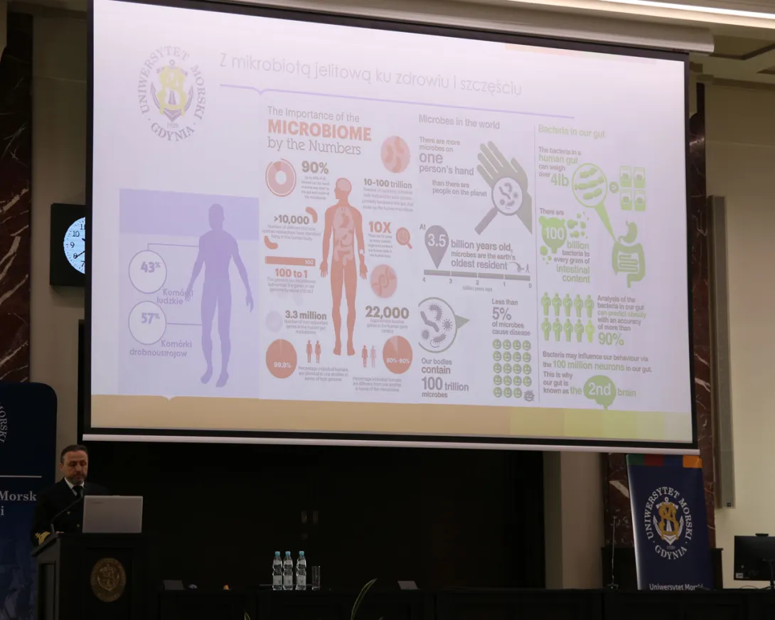 Prowadzący wyjaśnił pojęcie mikrobioty jelitowej oraz jej wpływu na funkcjonowanie całego organizmu. Omówił relację między kondycją fizyczną i psychiczną człowieka, a ilościowym i jakościowym charakterem mikrobioty.