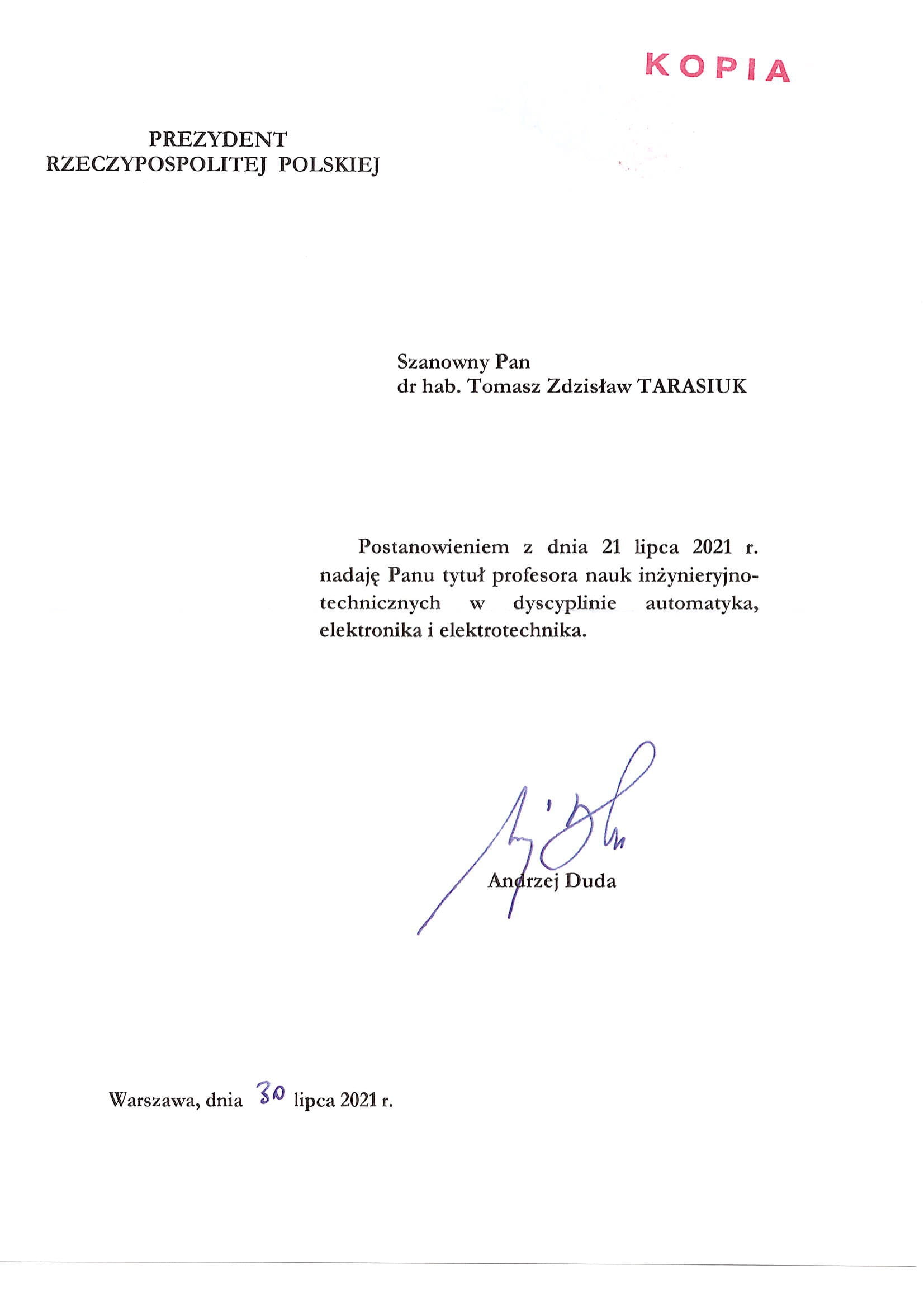 Prezydent Rzeczypospolitej Polskiej Andrzej Duda postanowieniem z dnia 21 lipca 2021 r. nadał dr. hab. inż. Tomaszowi Tarasiukowi, prof. UMG tytuł profesora nauk inżynieryjno-technicznych w dyscyplinie automatyka, elektronika i elektrotechnika.
