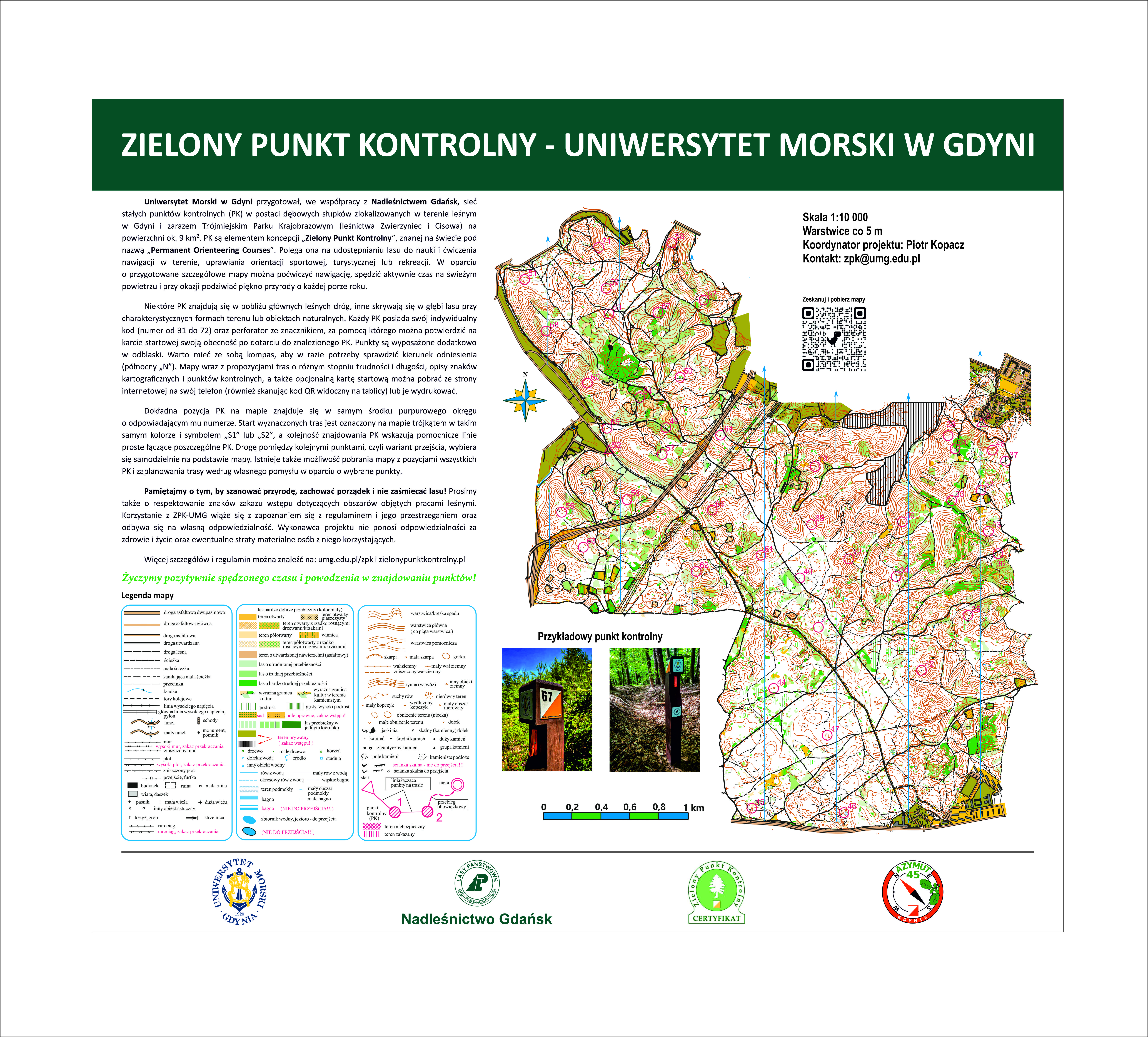 Uniwersytet Morski w Gdyni przygotował, we współpracy z Nadleśnictwem Gdańsk, sieć stałych punktów kontrolnych (PK) w postaci dębowych słupków, zlokalizowanych w terenie leśnym na powierzchni ok. 9 km2 w obrębie Gdyni (leśnictwa Zwierzyniec i Cisowa). PK są elementem koncepcji "Zielony Punkt Kontrolny" (ZPK), znanej na świecie pod nazwą "Permanent Orienteering Courses". Polega ona na udostępnianiu lasu do nauki i ćwiczenia nawigacji w terenie, uprawiania orientacji sportowej, turystycznej lub rekreacyjnej, w tym rozwijania umiejętności poprawnego czytania mapy oraz rozumienia jej ograniczeń. Korzystając z przygotowanych szczegółowych map, mogą Państwo poćwiczyć nawigację, spędzić aktywnie czas na świeżym powietrzu i przy okazji podziwiać piękno przyrody o każdej porze roku.